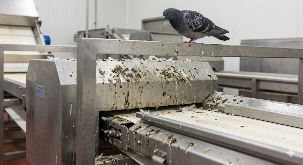 בתמונה זו ניתן לראות את אחד התרחישים החמורים ביותר בתעשיית המזון: יונה עומדת ישירות מעל מסוע פעיל. כתוצאה מכך, המכונות ופס הייצור מכוסים בלשלשת. מעבר למראה הדוחה, לשלשת יונים מכילה חיידקים מסוכנים (כמו סלמונלה) שחודרים ישירות למוצר הסופי. מצב כזה חושף את המפעל לפסילת סחורות בשווי עתק, תביעות נזיקין וסכנת סגירה מיידית על ידי משרד הבריאות עקב אי-עמידה בתקני תברואה.